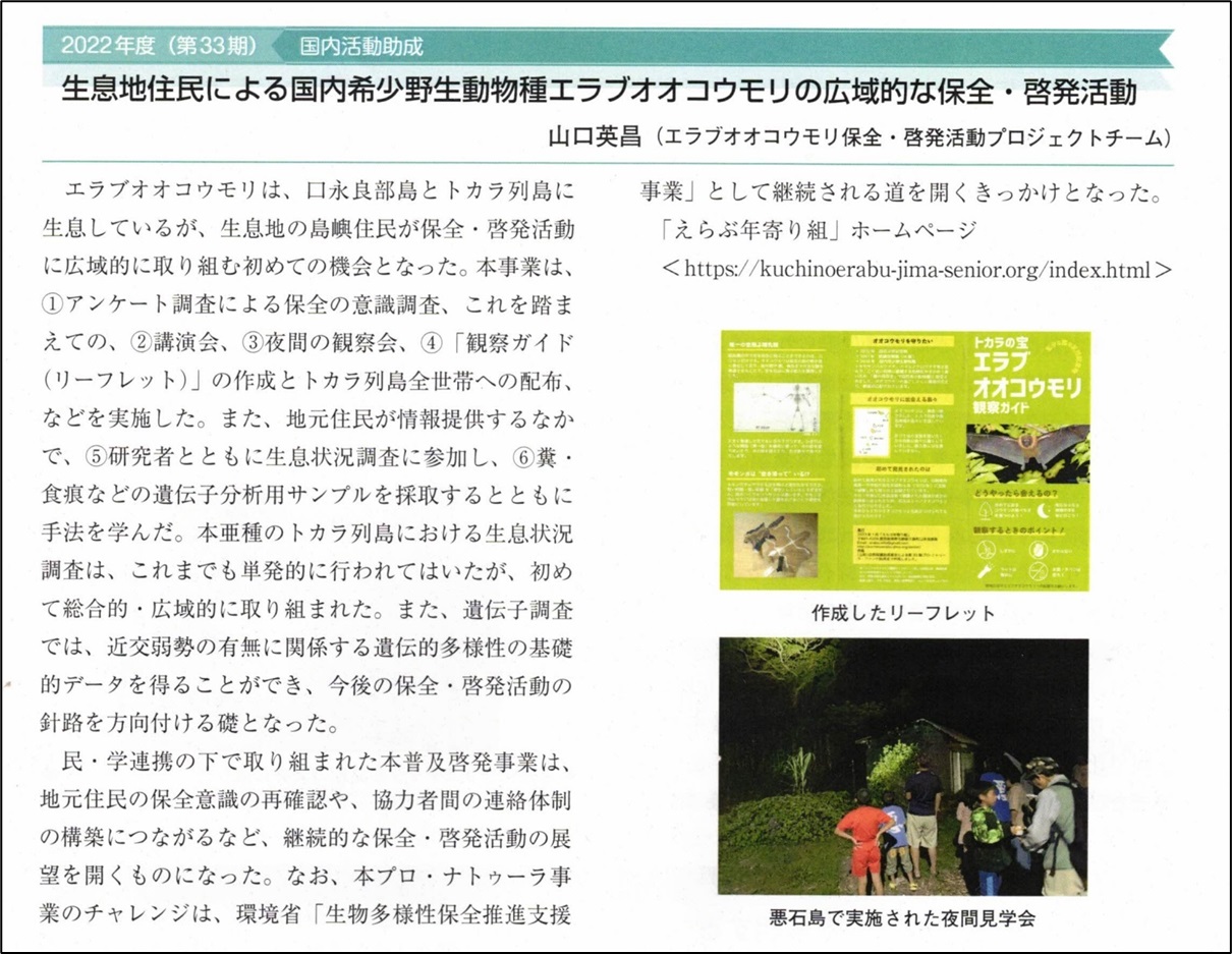 鹿児島国際大学の名誉教授船越公威氏や 国崎 敏廣 氏による、エラブオオコウモリの生態研究が、1980年代から続けられています。