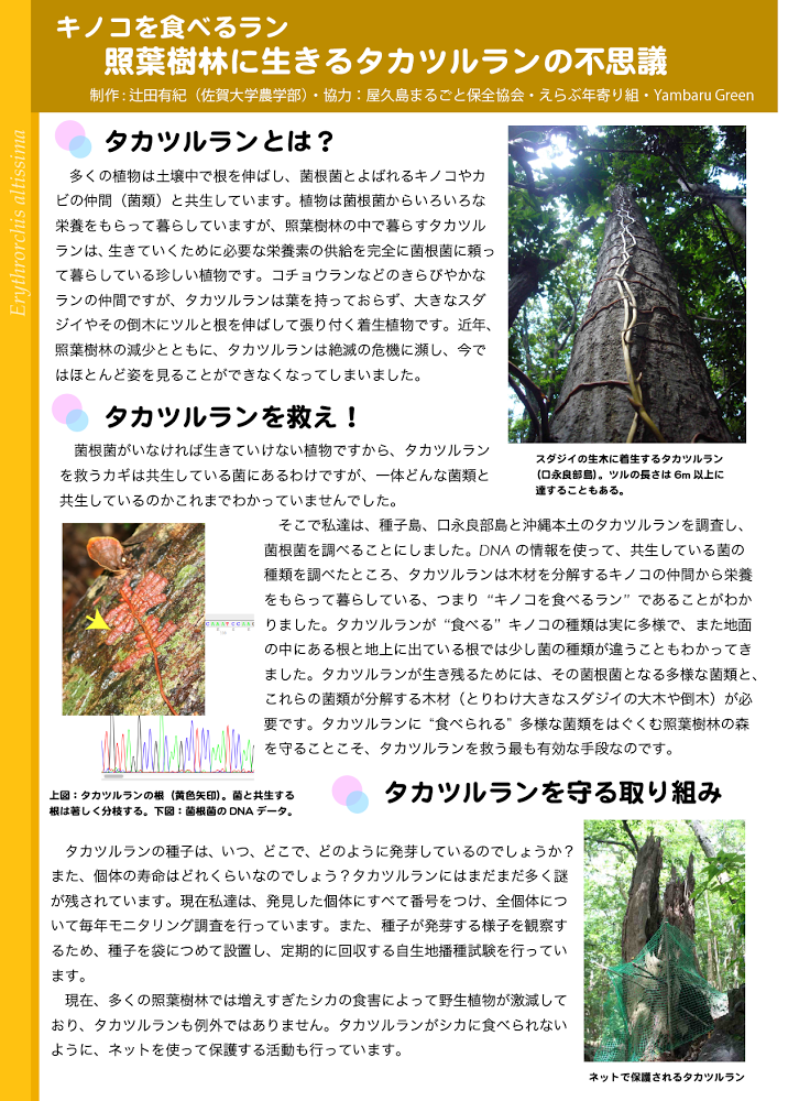 | 6月23日 | 屋久島環境文化財団に申請していた平成25年度研究助成が認められました。テーマは「屋久島と口永良部島における照葉樹林内の菌共生に関する保全と研究」で、タカツルランの調査・研究です。屋久島まるごと保全協会、東北大学植物園と共に、えらぶ年寄り組も参加します。 | |||